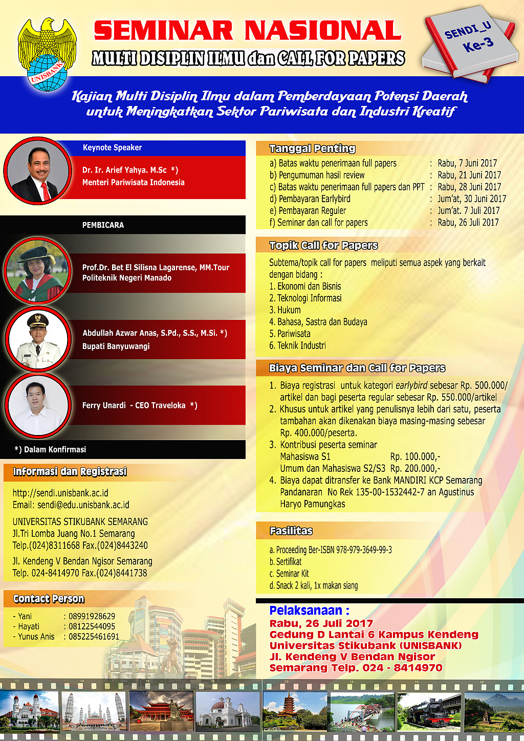 Seminar Nasional Multi Disiplin Ilmu & Call for Papers UNISBANK (SENDI_U) Ke-3 Seminar Nasional Multi Disiplin Ilmu (SENDI_U) merupakan kegiatan Seminar & Call For Papers rutin yang diselenggarakan oleh Universitas Stikubank (UNISBANK) setiap tahun. Call For Papers meliputi bidang : Teknologi Informasi, Ekonomi dan Bisnis, Bahasa dan Ilmu Budaya, Hukum, Pariwisata dan Teknik Industri.